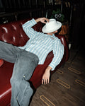 The Rangers Stripe Shirt in Sky is designed for easy summer layering with a relaxed, oversized fit. Featuring crisp vertical stripes and intentional distress accents, the shirt carries a quiet ruggedness beneath its fresh tone. The Instinct Rangers chest patch anchors the look, adding a utility-inspired edge to an otherwise breezy silhouette.