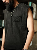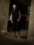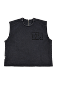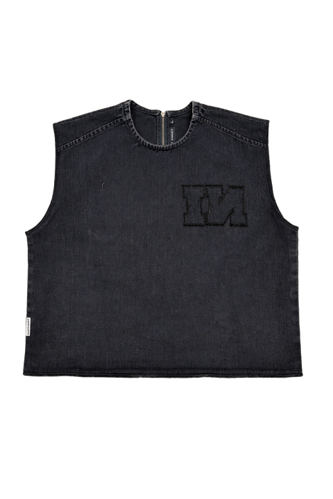 A washed black denim vest with gothic undertones and a structured profile. Clean edges meet a tonal raised applique on the chest for a minimal but assertive surface identity.
