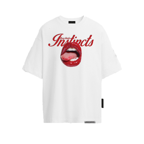 Make a statement without saying a word. The Instincts oversized tee blends bold energy with street-ready comfort. Featuring a high-impact red lips graphic and retro “Instincts” lettering, this piece captures raw emotion and attitude in every stitch.
