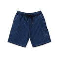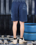 This navy blue fabric has a subtle denim- washed effect complemented by faded stripes that adds a vintage touch. These shorts come with an adjustable fit at the waist for a customized fit and four convenient pockets- two at the sides, one at the bottom left and one at the back for all your essentials.