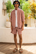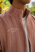 Our Salmon Jacket is crafted from high-quality linen, bringing breathability and comfort together, perfect to wear it anytime of the year. The soft pink hue, complemented by stripes pattern adds a contemporary touch to it. This full sleeves jacket features a zipper that extends just above the collarbone, giving you the option to wear it open or zipped up. On the chest area, at the right is “instinct est 2020” embroidered in white and on the left is a patch pocket for a balanced design.